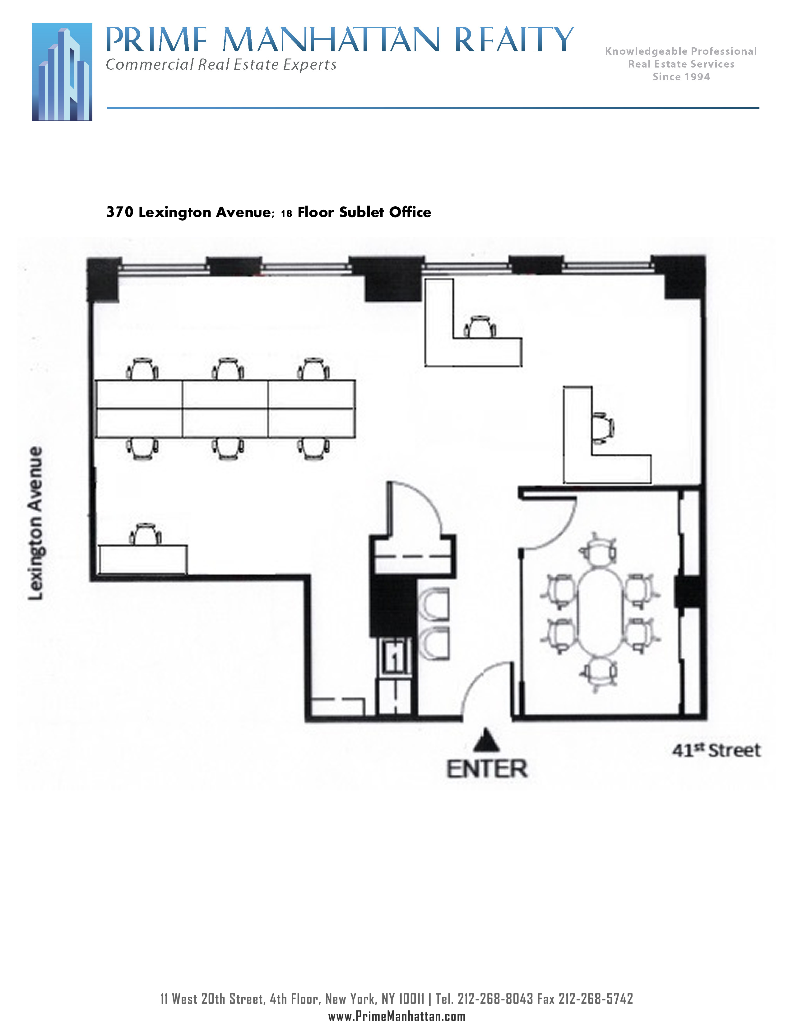 Ideally situated on the corner of 41st Street in the heart of the Midtown East neighborhood. This well maintained and managed building is a short 2 block walk from the entrance of Grand Central Terminal Station provides easy access for clients and employees to all Public transportation Metro North and MTA Subways and busses. A short walk from Bryant Park and Tudor City provides an ideal location for your new office space.
