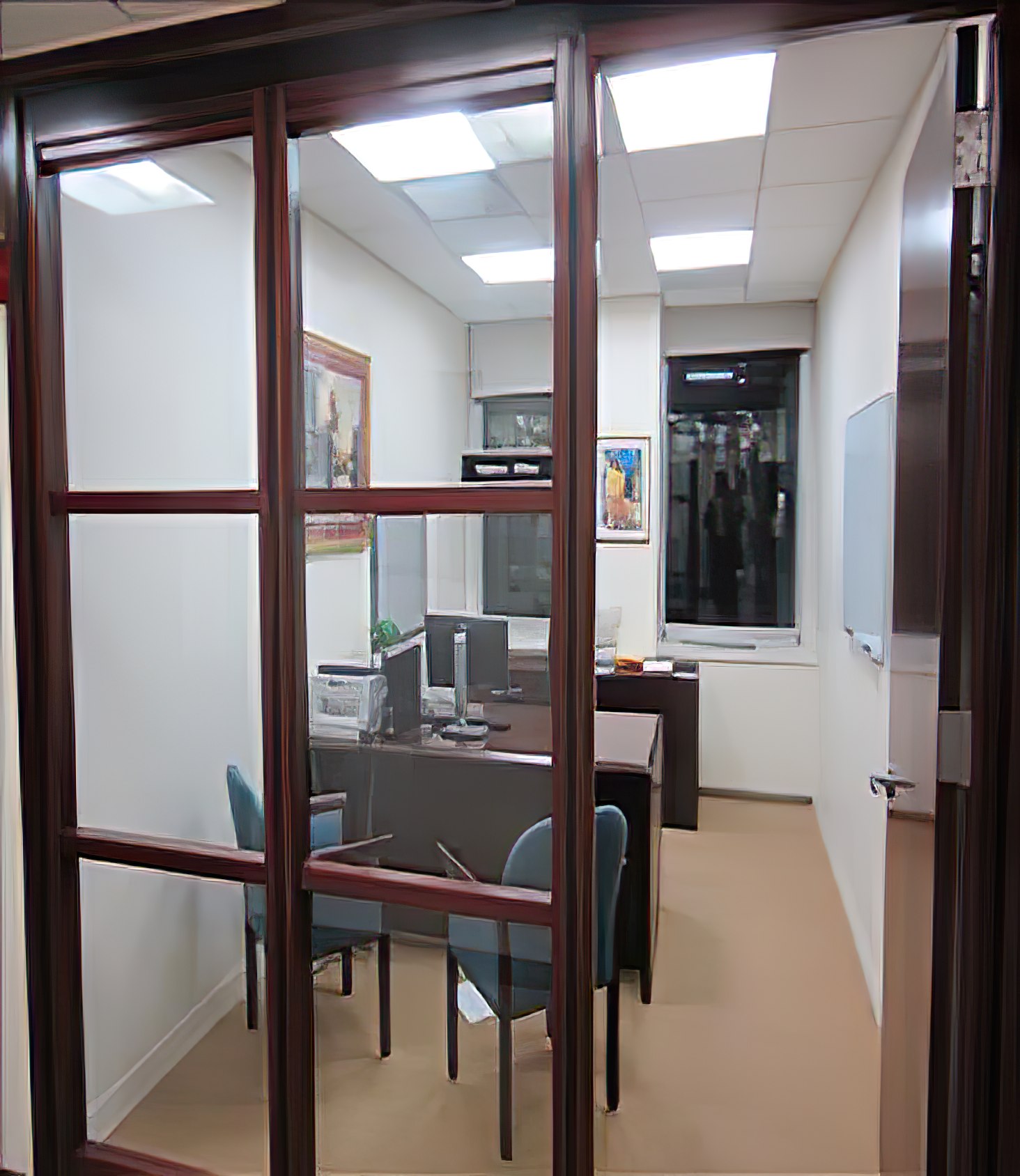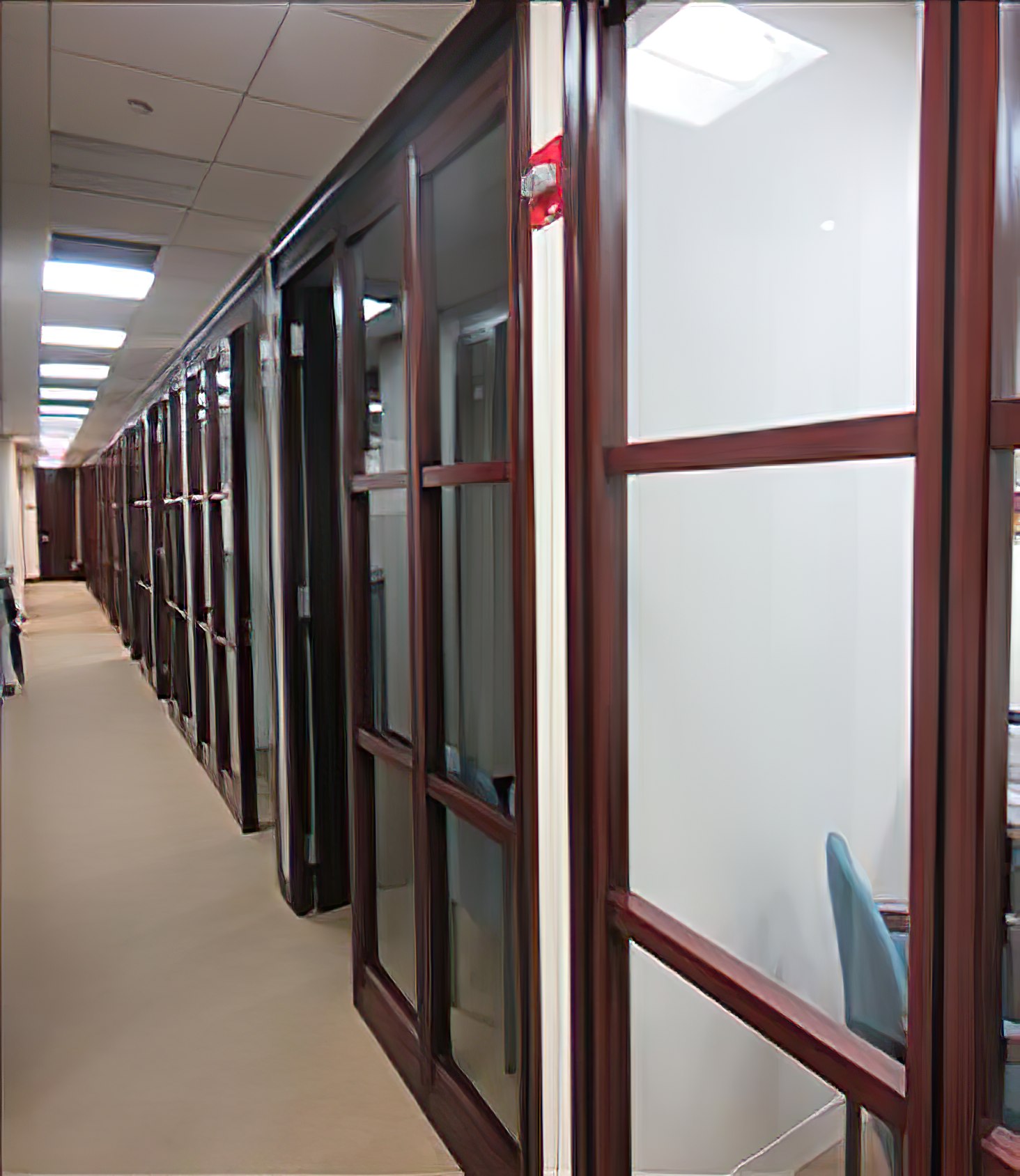 Enjoy brilliant sunlight in the perimeter offices, further reflected into the space via custom wood and glass lattice office walls.