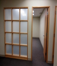 • drop panel ceilings, carpeted floors, and frosted glass inserts