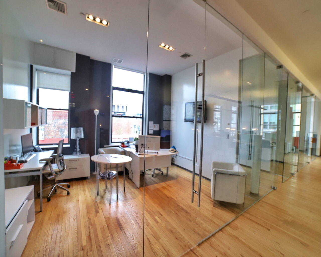 - 3 Conference Rooms with Windows and 12 foot high Glass Doors