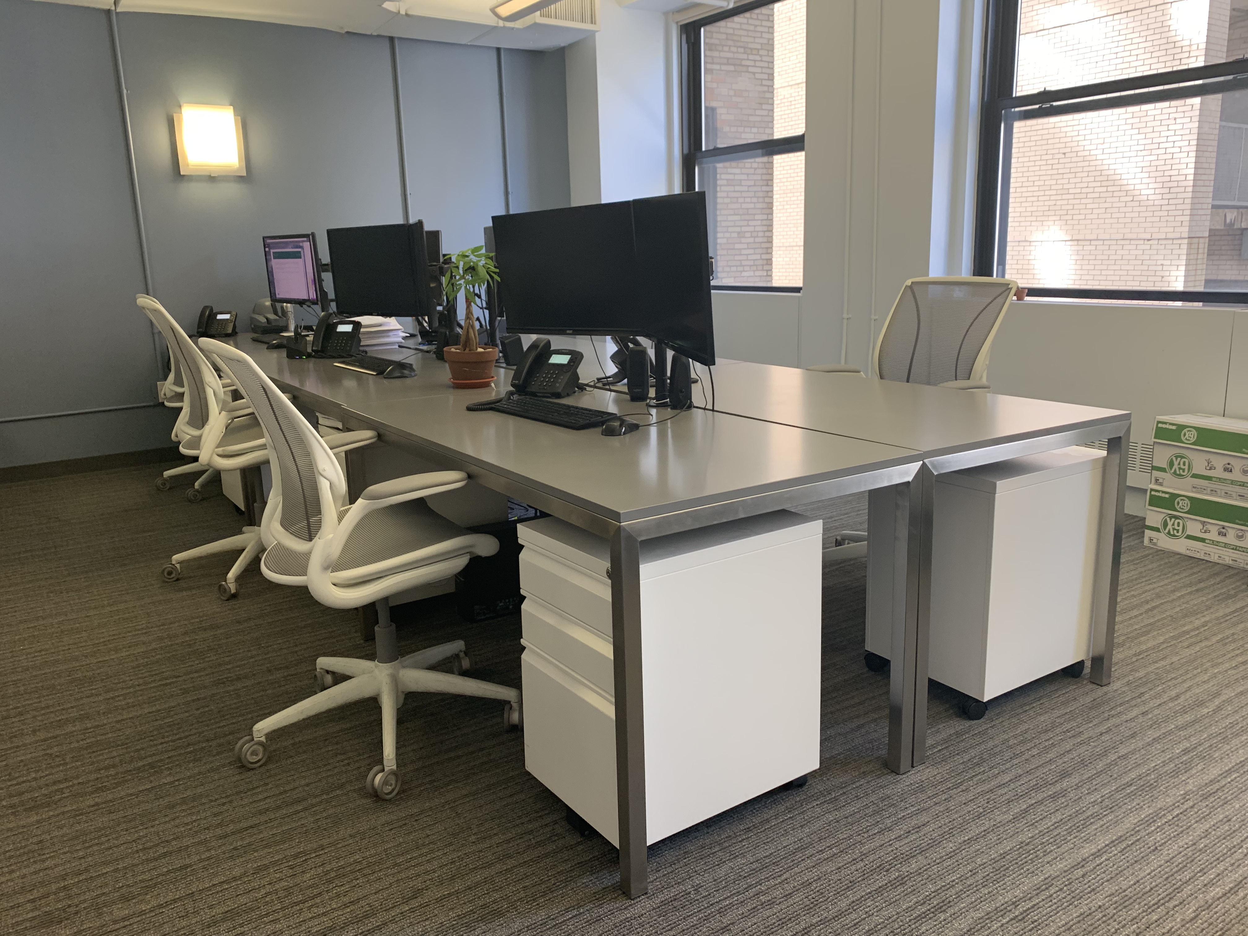 The 18th floor space being offered for sublease is very high quality. Fully furnished and wired, offering a plug and play solution for any end users looking for an easy transition into efficient office space. Ideally positioned on the floor to receive the best light. Through the wood privacy door employees and client are welcomed into a cozy reception area off the large glass fronted conference room with seating for 6 to 8 people. Four (4) large southern facing windows allow the space to be filled with light all day long and illuminate the 8-10 person trading style desks. The space s, which can be densified to accommodate 12 people in bench style seating. The high exposed ceilings in the open area along with the charcoal grey carpet provides a comfortable working atmosphere for the team. A full wet pantry with fridge, sink, and microwave provides an efficient office space with the kitchen amenities of home. The kitchenette also has full cabinets (Upper and Lower) for additional storage. Open high exposed ceilings with updated lighting fixtures and exposed ductwork throughout provide a creative, professional and open feel to the work environment. The rectangular layout provides a productive and cohesive working space for the team. This south facing unit has four (4) windows that let light enter the space providing great energy to the office. The efficient open floor plan off reception area provides a welcoming feel. Perfect for Media, Technology, Business Services, Law Firm, Financial Services, or family office looking an efficient office space option. This Move-in Ready!