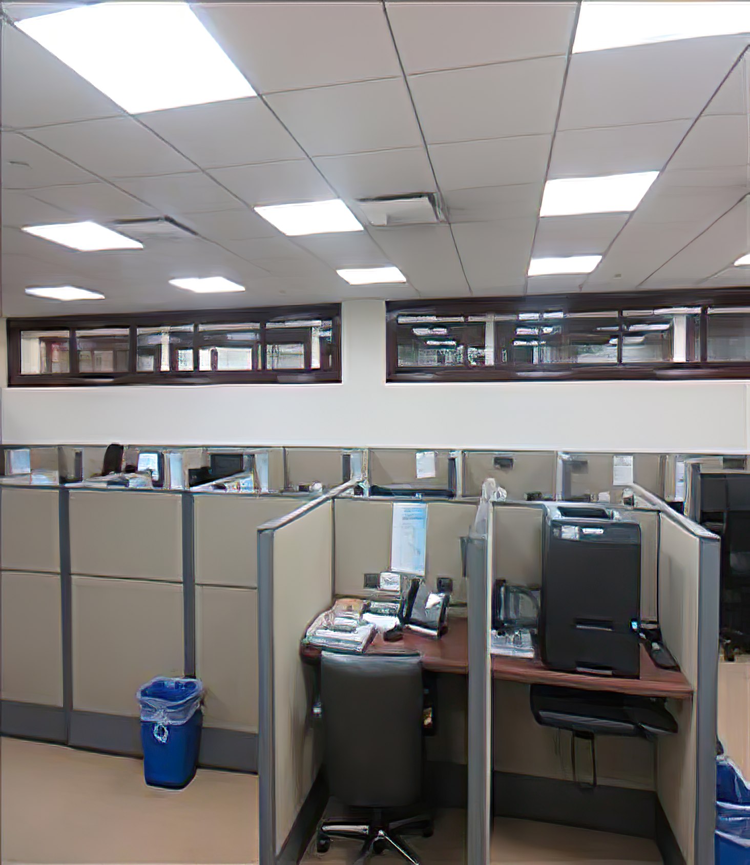 Enjoy brilliant sunlight in the perimeter offices, further reflected into the space via custom wood and glass lattice office walls.